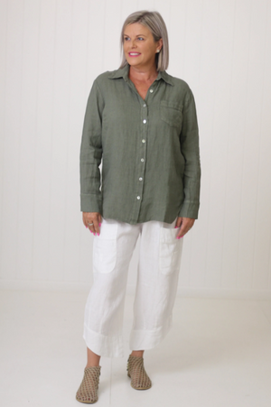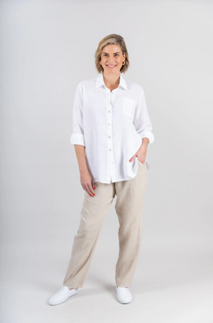 The Blair Linen Top is a classic button down shirt that is suitable for all ages. It features a single breast pocket.