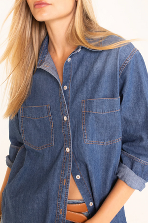 Our Iconic Denim Shirt now available in a Dark Wash. A smaller fit to the Boyfriend style, this shirt is an easy fit and true to size.