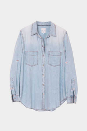 Our Iconic Denim Shirt now available in a Denim Stripe. A smaller fit to the Boyfriend style, this shirt is an easy fit and true to size.